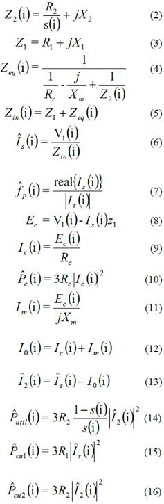 La figura 6 indica los parámetros eléctricos del motor, referidos al estator, por fase. Como se indicó anteriormente, R1 se mide directamente (12.2 Ω), por tanto, los parámetros a estimar son la inductancia del estator X1, la inductancia del rotor X2, la resistencia del rotor R2, la resistencia equivalente del hierro Rc y la reactancia del hierro Xm. Todos los algoritmos de optimización utilizados aquí buscan minimizar una función de costo que incluye estos parámetros eléctricos y las medidas realizadas para determinar las pérdidas del motor.