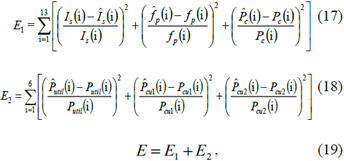 donde E1 corresponde al error relativo al cuadrado para las pruebas de vacío (7) y carga (6), mientras que E2 corresponde al error relativo al cuadrado para las pruebas bajo carga (6). E corresponde al error total que se va a minimizar usando los algoritmos de optimización indicados anteriormente.