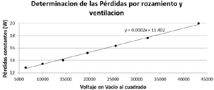 Las primeras pérdidas que se estiman, según la norma CIE, son las debidas al rozamiento y ventilación. Para ello se grafican las pérdidas constantes del motor en vacío, en función del voltaje aplicado al cuadrado, tomando por lo menos 7 valores de voltaje, incluyendo el nominal. Las perdidas constantes corresponden a las pérdidas en vacío menos las perdidas en el cobre. Las pérdidas en el cobre se determinan a partir de la corriente por fase y la resistencia medida del estator (12.2Ω usando un ohmímetro). Las pérdidas por rozamiento y ventilación corresponden a las pérdidas de potencia que existirían a una tensión de 0 V. La figura 2 muestra las pérdidas constantes, así como la curva de regresión. Las pérdidas por rozamiento y ventilación estimadas son de 11.4 W.