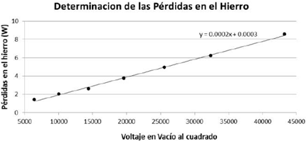 Las pérdidas en el hierro se obtienen restando las pérdidas por rozamiento y ventilación a las pérdidas constantes en vacío. La figura 3 muestra las pérdidas en el hierro en función de la tensión al cuadrado. Para las pruebas bajo carga, se emplean al menos 6 valores diferentes del par, incluyendo el par nominal. Las pérdidas bajo carga en el cobre del estator se obtienen de la resistencia por fase medida y la corriente por fase medida. Las pérdidas bajo carga en el cobre del rotor se obtienen restando a la potencia absorbida las pérdidas en el cobre del estator más las pérdidas en el hierro; esta potencia se refiere al rotor multiplicando por el factor de deslizamiento, bajo carga.