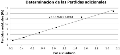 Finalmente, las pérdidas residuales corresponden a la potencia absorbida por el motor menos la potencia útil del motor (par en Nm por velocidad en rad/s) menos las pérdidas en el cobre tanto del estator como del rotor, menos las pérdidas en el hierro, menos las pérdidas por rozamiento y ventilación. Las pérdidas residuales se grafican en función del par al cuadrado para obtener la pendiente indicada en la figura 4. Las pérdidas adicionales se calculan multiplicando la pendiente hallada por regresión por el par al cuadrado.