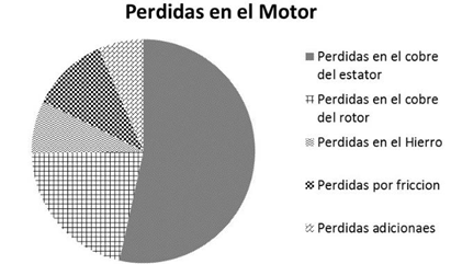 Estos resultados indican que se puede obtener una medida precisa de la eficiencia del motor usando el método de la suma de pérdidas con medida de par, con la gran ventaja de obtener adicionalmente información detallada de cada una de las pérdidas de potencia en el motor. En este caso, como se observa en la figura 5, más del 50 % de las pérdidas del motor corresponden a las pérdidas en el cobre del estator. Para aumentar la eficiencia de este motor sería aconsejable reducir las pérdidas en el cobre del estator mediante el uso de un calibre mayor.