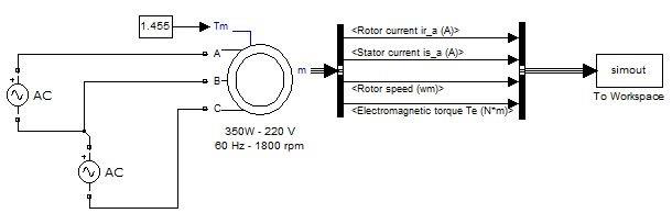 Matlab ofrece un modelo del motor de inducción trifásico en la librería SimPowerSystems. La figura 9 muestra el modelo del motor trifásico alimentado con los parámetros hallados usando el algoritmo de búsqueda de armonía. Se observa en esta figura que se le aplicó el par nominal (1.455 Nm). El modelo arroja 21 variables medidas del motor de inducción. En la figura 9 se muestra un bus selector que selecciona 4 de las 21 variables: corriente en el rotor, corriente en el estator, velocidad del rotor y par electromagnético. La figura 10 muestra el transitorio en la corriente del rotor.