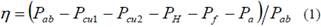 donde Pab es la potencia absorbida; Pcu1 , las pérdidas en el cobre del estator; Pcu2 , las pérdidas en el cobre del rotor; PH, las pérdidas en el hierro; Pf, las pérdidas por fricción, y Pa, las pérdidas adicionales. La eficiencia del motor calculada por este método fue de 0.71. Este valor es bastante cercano al calculado mediante el método directo, donde se mide la potencia absorbida y la útil, en cuyo caso η=Putil/Pab, correspondiente a una eficiencia de