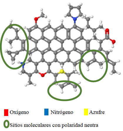 Por otra parte, los asfaltenos son hidrocarburos de alto peso molecular presentes en solución en el petróleo crudo y que se retienen durante su procesamiento, pasando a ser parte de los residuos del proceso de refinación. En su estructura, tal como se muestra en la figura 1, se encuentran sustituciones de átomos de carbono por heteroátomos, tales como oxígeno, nitrógeno, azufre y metales pesados, en los cuales la electronegatividad diferencial determina la existencia de enlaces polares dispersos en el interior de la molécula [10]. Los focos de polaridad se adhieren a la superficie de los sólidos neutros por medio de interacciones atómicas débiles, y forman así una película, mientras que dejan expuestas sus terminales neutras disponibles para interactuar con el medio [11].