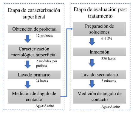 La figura 2 presenta el diagrama general del proceso de obtención de especímenes, caracterización, aplicación del tratamiento de alteración superficial y evaluación de la efectividad del tratamiento.