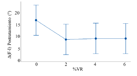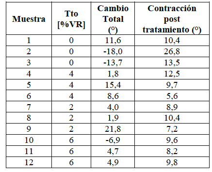 Para cada uno de los experimentos desarrollados se calculó la diferencia entre los ángulos finales pre y postratamiento; además, se consideró dentro del análisis la contracción del ángulo de contacto, calculada como la diferencia entre el ángulo inicial y final para el postratamiento, tal como se muestran en la tabla 6.