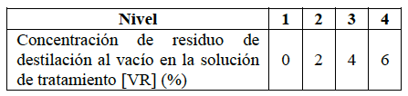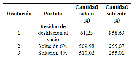 A continuación, la tabla 2 presenta las cantidades empleadas en el proceso, partiendo de una solución con concentración de 6 % de residuo de destilación al vacío, que por disolución fue llevada a las concentraciones requeridas, para un total de 200 mL de solución por muestra.