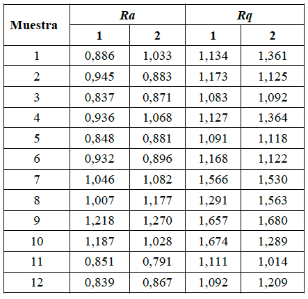 La tabla 3 presenta los resultados obtenidos de Ra y Rq para las muestras analizadas, siguiendo el protocolo de experimentación y análisis de datos detallado en la norma ISO 4287-1997 [16]: