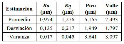 La tabla 4 presenta el valor promedio, desviación y varianza asociados a los parámetros superficiales evaluados: