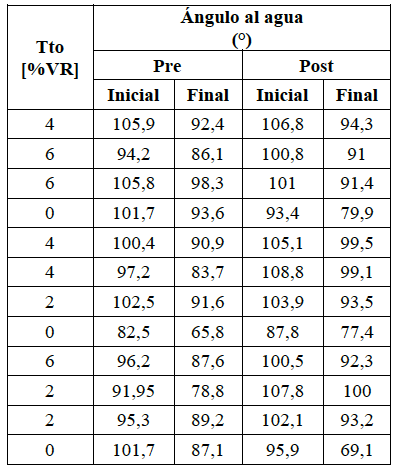 La tabla 5 muestra para cada uno de los experimentos desarrollados: el número de muestra correspondiente codificado desde el análisis de rugosidad, el tratamiento realizado [%VR], ángulos de contacto al agua iniciales (instante cero de contacto) y finales (después de un periodo de estabilización de un segundo) pre y post tratamiento (°), teniendo en cuenta un proceso de aleatorización en la ejecución de los experimentos: