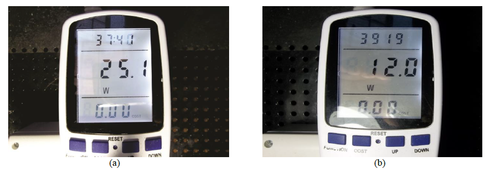 La Figura 10 (a) muestra la potencia máxima del motor, registrada por el vatimetro (True RMS). Con 0.88 (Amperios RMS)* 220 (Voltios RMS) * 0.13 (coseno de fi) = 25.1 (Watts), potencia activa en vatios. Girando a 3000 (RPM), velocidad de sincronicidad de la corriente alterna (AC). La Figura 10 (b) muestra la potencia mínima del motor, según fórmula (2), registrada por el vatimetro (True RMS) con control de potencia encendido (economiza energía). Con 0.21 (Amperios RMS) * 77 (Voltios RMS) * 0.74 (coseno de fi) = 12 (Watts), potencia activa en vatios. Girando a 3000 (RPM), velocidad de sincronicidad de la corriente alterna.