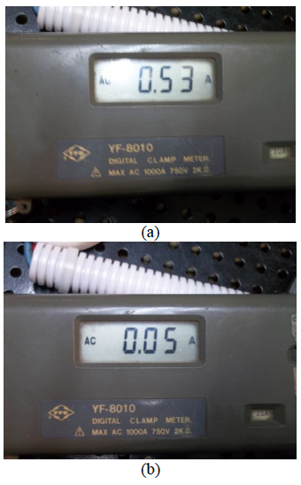 En la Figura 12 (a) la pinza amperimétrica (True RMS) indica un consumo de 0.53 (Amperios) y en la Figura 12 (b) se evidencia 0.05 (Amperios), lo cual significa una reducción de un 90% de la intensidad de la corriente eléctrica con una pinza de mayor precisión según el Laboratorio de Mecatrónica de la UNER (Universidad Nacional de Entre Ríos).