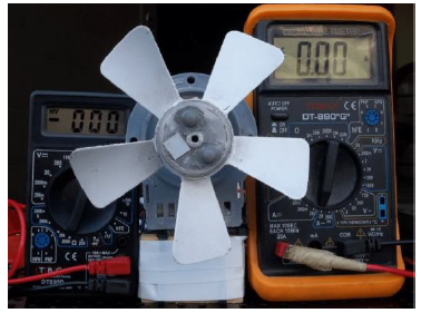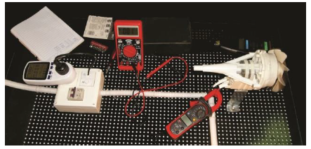 En la figura 4 se observa el 2° prototipo del año 2018, el banco de pruebas, con foto-tacómetro laser, power-meter o medidor de consumo de energía eléctrica (kWh), vatímetro, pinza amperimétrica (AC) True RMS y voltímetro de corriente alterna (AC) True RMS.