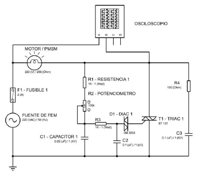 Se debe aclarar que por las características del tipo de diseño del circuito que combina aspectos electrónicos (Diac y Triac) con electromecánicos (motor), se tuvieron problemas con la utilización del software de simulación: Proteus Design Suite 8 CAD. Este software está bien adaptado para la simulación eléctrica y electrónica, pero no para los aspectos electromecánicos en corriente alterna (AC); pues, todos los motores disponibles en el paquete informático son para aplicaciones de corriente continua (DC). Por lo que la carga (load) se simuló con una circuito R (resistivo puro) equivalente a la impedancia de un circuito R-L de un motor síncrono (o sincrónico).