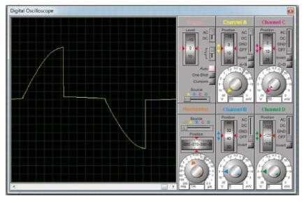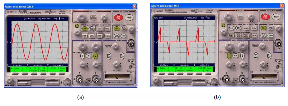 A continuación, en la Figura 8 se ilustra la simulación lograda para ser visualizada en el osciloscopio Agilent XSC 3 [25] del software NI Multisim 14.0 [26], se observa que a mayor potencia activa (Figura 8 (a)) el motor utiliza el total de la onda sinusoidal de la tensión (Vrms) e intensidad de la corriente (Arms). Pero en el motor síncrono (o sincrónico), cuando la onda sinusoidal es recortada por el disparo del Triac (Figura 8 (b)) desciende el consumo de energía activa (kWh) por reducción de la potencia promedio o media activa (Pmed) medida en vatios (Watts). Esta simulación del circuito conectado al osciloscopio Agilent XSC 3, del software NI Multisim 14.0, presenta una mejor representación visual de la onda completa y recortada (disparo del Triac) para el mismo circuito eléctrico/electrónico anteriormente simulado en el Proteus Design Suite 8 CAD.