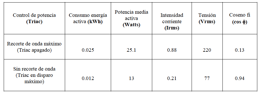 Dependiendo donde se localicen los instrumentos de medición en el diseño del circuito y se tomen los datos, los valores fluctúan. En la Tabla 1se observan las variaciones –fluctuaciones- en función del estado de operabilidad del Triac (apagado y encendido). Se tomaron en los contactos de ingreso al circuito R-L del devanado inductor (estator) en la máquina rotativa (motor sincrónico). Los valores de potencia media activa (Watts) y consumo de energía activa (kWh) se tomaron en la entrada de f.e.m. (fuerza electro motriz) en todo el circuito R-L-C (electromecánico y electrónico).