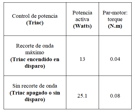Para el primer caso, que el motor trabaja a máxima potencia, sin recorte de la onda AC (Triac apagado): 25.1 (W), los cálculos de la fórmula nos brinda un par-motor (torque) de: 25.1 (W)/314.159 (rad/s)= 0.08 (N.m). Para el segundo caso, que el motor trabaje a mínima potencia (con el Triac en máximo ángulo de disparo): 13 (W), los cálculos de la fórmula nos arrojan un par-motor (torque) de: 13 (W)/314.159 (rad/s)=0.04 (N.m).