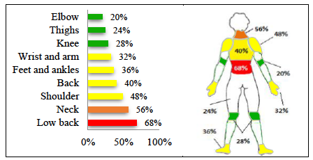 Below is the main activities that stevedores perform in their shift work, the handling of heavy objects in one of the most common tasks (See Figure 1). Regarding the results of the analysis of comfort by Nordic questionnaire, we found that the total respondent’s stevedores have or have ever submitted musculoskeletal discomfort attributed to the positions and work-related efforts. As noted, stevedores have discomfort in most areas of their body. Among the most common complaints, include those located in the lower back (68%), neck (56%) and shoulders (48%) (See Figure 2).