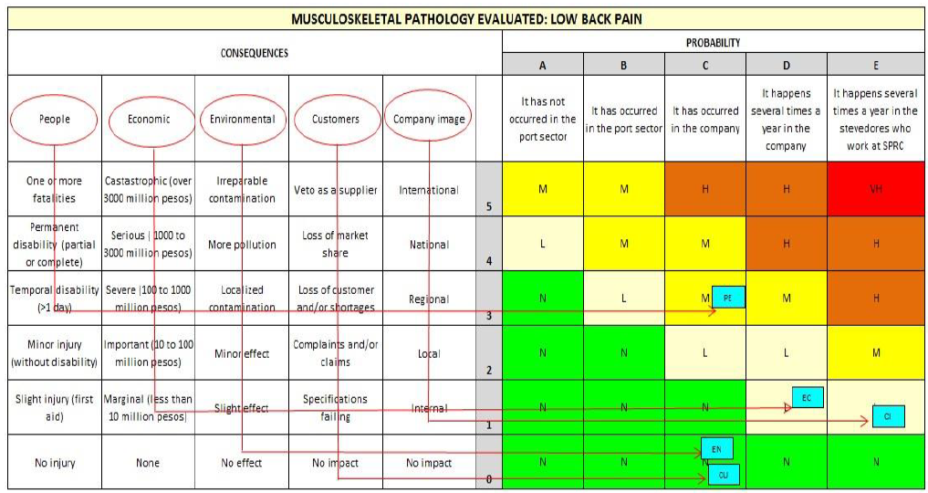 The back pain has been presented, generating some sick leaves for longer than a day, which is reflected on a marginal economic impact, but significant for the company. Even though this pathological condition has not generated any positive or negative impact on the customers, it really has affected the inside company’s environment in terms of the worker’s motivation to develop new activities. The risk level of suffering low back pain because of the bad posture habits, heavy physical works, trunk rotation movements, among others, was level 3, medium grade, which means that the established control systems are not enough.