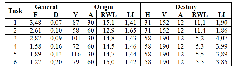 The table 1 shows the horizontal and vertical distances on the origin and destination points are higher than the ideal figures to lift a load. It should be noted that in most of the tasks, there is a good grasp, which is considered positive in this activity. At the same time, it shows the results of the NIOSH method (simple version) on the origin and destination points for each task that integrates the global activity. This is the first stage of the NIOSH method application for compound task (H in origin is 27cm).