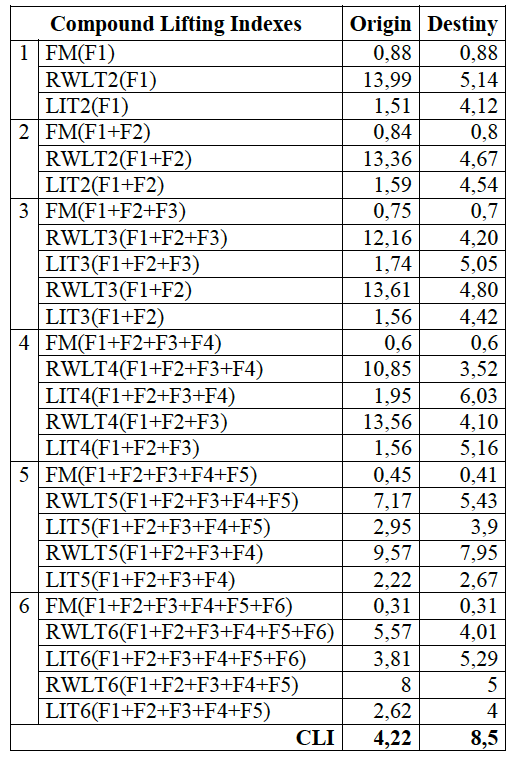After, the multipliers of each task were compared on the origin and destination points, and it was concluded that corrective measures must be applied at the destination point, especially on the horizontal distance and vertical position of the load since they are the figures closer to zero (0). This means that they are far from the ideal measures (25cm y 75cm for H and V respectively) when it comes to handle a load. In addition, the researchers observed that the real weight of load exceeds the limits of recommended weight (RWL) for the height and depth points at destination, which means that stevedores do too much physical effort when they are leaving the load. The results of the second stage are shown on table 2 where the index of compound lifting was 4.22. This data indicates a high and unacceptable risk level, so the literature recommends a redesign of the workplace immediately. Likewise, it is shown that the lifting index for destination was 8.50, overtaking by more than 50% the compound-lifting index at the origin, which means that at the destination point, there is also a high and unacceptable risk level. This confirms the severity of the risk factor by load lifting on these tasks.