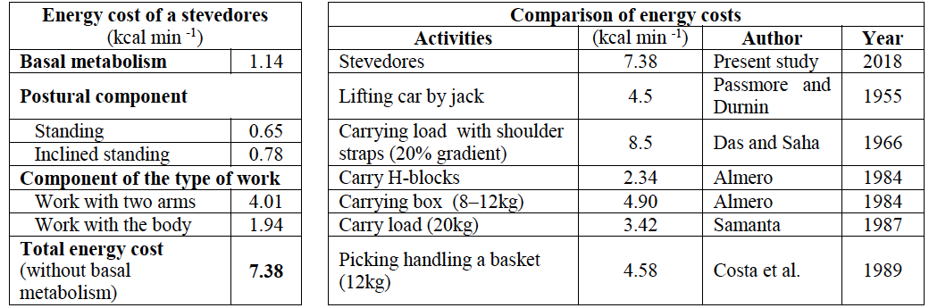 As it is observed, the stevedores have a high physical load in trunk and arms (without considering a basal metabolism) of approximately 7.38kcal min-1. In comparison with other studies related to metabolic expenditure [16-19], only some jobs such as carrying load with shoulder straps (20% gradient) exceed the metabolic cost derived from this work [20,21].