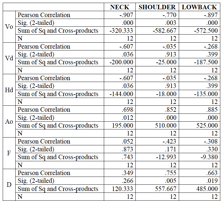 According to Shapiro Wilks P figures, we concluded that the data set of discomforts intensities on the neck (0,37), shoulders (0,09) and low back (0,11) followed a normal distribution since this P figure is greater than 0.05, so the null hypothesis presented recently is accepted. We showed the results of the correlation analysis between the variables on Table 4.