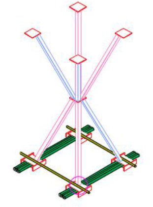 El diseño de estas estructuras considera la participación de la losa de concreto armado como elemento de cuerda en compresión. La cuerda en tensión se solventa empleando varillas corrugadas de acero, mientras que para las diagonales se emplean ángulos dobles formando cajón o perfiles tubulares cuadrados. Las tridilosas se caracterizan por estar formadas por “piñas”, ver Figura 2, estos son elementos básicos de la armadura tridimensional mixta y está formada por ocho barras, cuatro forman una pirámide de base cuadrada y las otras cuatro forman otra pirámide de base cuadrada pero invertida, uniéndose ambas en una placa intermedia.Este tipo de estructuras es particularmente liviana lo que ha permitido su empleo para librar claros del orden de hasta 60 m, con un considerable ahorro en materiales. Debido al incremento en la magnitud de cargas, a la sensibilidad de la estructura a la corrosión, por formarse con elementos de acero de poco espesor, así como por la gran cantidad de soldaduras involucradas, se presentaron casos de fallas en estos puentes, lo que conllevó a un programa de rehabilitación o sustitución de los mismos.
