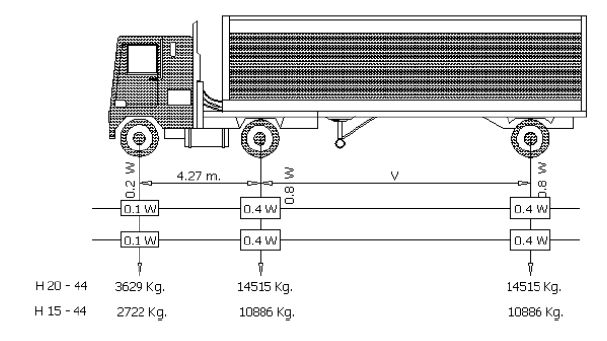 La carga viva vehicular de diseño en la época en que fue construido este puente (1980) era la HS-20, con un peso total de 32,700 kg, como se observa en la Figura 3. Actualmente la carga viva de diseño en México es la establecida por el Instituto Mexicano del Transporte (IMT) nombrada IMT 66.5 (ver Figura 4), misma que supera en más del doble en peso a la HS-20 [2][3].