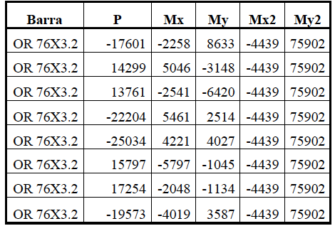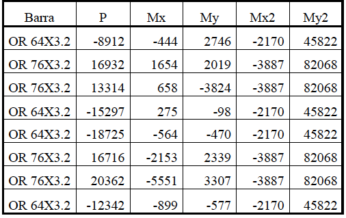 Para la Piña No. 1 se obtuvieron los elementos mecánicos corregidos que se presentan en la Tabla 1, donde Mx2 y My2 son los momentos flexionantes en las barras debidos a la excentricidad de las mismas en el nudo intermedio: