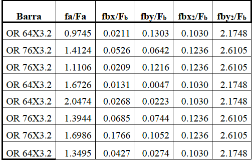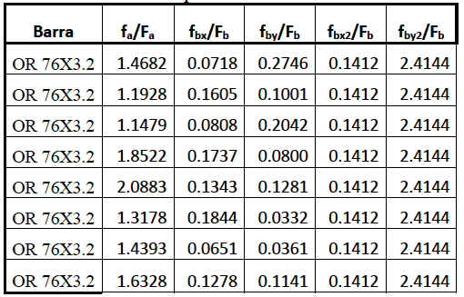 Los cocientes entre los esfuerzos actuantes y los esfuerzos permisibles se presentan en la Tabla 2, donde fa representa los esfuerzos actuantes por carga axial, mientas que fb representa los esfuerzos axiales por flexión: