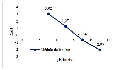 El pH cuando la suma de las cargas en la superficie (positivas y negativas) de la biomasa es cero, se define como punto de carga cero (pHpzc). Para determinarlo se empleó la metodología propuesta por Kakoi Beatrice et al. [19] con algunas modificaciones; inicialmente se tomaron 50 mL de agua desionizada y se adicionaron en recipientes de 100 mL, ajustando el pH a valores iniciales de 3,10; 5,05; 7,00 y 9,02 adicionando las cantidades necesarias de HCl 0,1 M o NaOH 0,1 M. Luego, a estas soluciones se les agregó 1 g del coagulante natural de médula de banano, posteriormente se agitaron en un Shaker a 27 °C, 180 rpm durante 24 h (MYR4000, Sea Star). Finalmente, se midieron los pH finales de cada una de las soluciones utilizando un potenciómetro (ST2100, OHAUS). El pHpzc corresponde al punto donde la curva producto del delta de pH en función de pH inicial corta el eje horizontal.