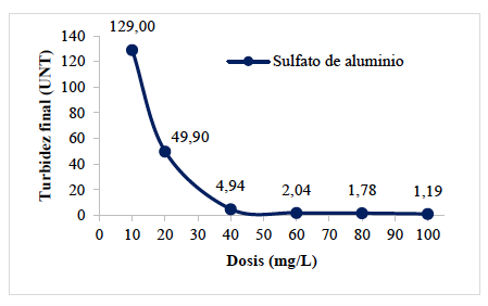 El sulfato de aluminio removió 97,65% de turbidez, información que coincide con los resultados obtenidos de otras investigaciones. En el año 2017, se observó que al usar una dosis de 40 mg/L de esta sustancia química, se remueve 99,78% de este parámetro, es decir, el río Magdalena en el departamento del Atlántico con una turbidez inicial de 462 UNT después de la clarificación del agua se obtiene un valor de 1,02 UNT [24].