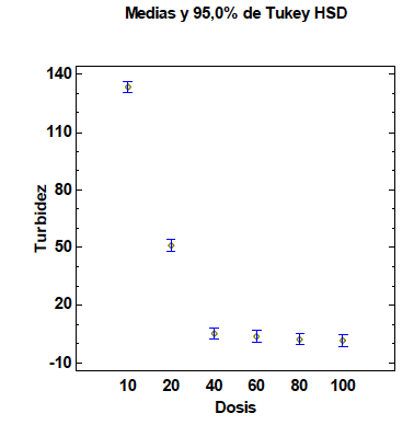 Las medias de la turbidez final del agua analizada presentaron los siguientes valores: 133,67; 51,17; 5,22; 3,57; 2,30 y 1,59 usando las dosis de 10, 20, 40, 60, 80 y 100 mg/L respectivamente. Se observan 3 grupos homogéneos, las dosis de 10 y 20 mg/L corresponden a los dos grupos que no están alineados entre sí. Por otro lado, se presenta un grupo comprendido por las dosis de 40, 60, 80 y 100 mg/L que muestran mejores resultados de turbidez, logrando con la última dosis obtener un valor inferior (1,59 UNT) al parámetro establecido para el consumo de agua potable (2 UNT). Sin embargo, la dosis óptima es 40 mg/L porque utiliza la menor cantidad de coagulante, obteniendo una turbidez final de 5,22 UNT que no cumple con la Resolución 2115 del año 2007 porque sobrepasa el valor máximo de turbidez exigido.