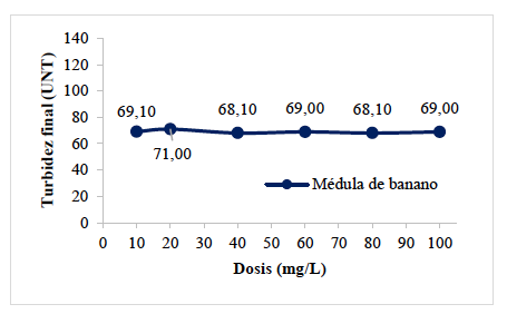 La médula de banano removió la turbidez del agua del río Magdalena en 67,57% cuando inicialmente este parámetro tenía un valor de 210,00 UNT. Este porcentaje de remoción es menor al obtenido en el año 2016, en la cuenca del río Nairobi-Kenia, donde se determinó que una dosis de 100 mg/L de médula de banano remueve el 98,56% de la turbidez del agua, que inicialmente tenía 279 UNT; finalmente este parámetro alcanza un valor de 4 UNT cuando el agua de este río tiene un pH de 4,0 [18].