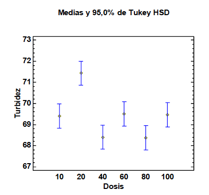 En la Figura 5, se muestra el contraste múltiple de medias de Tukey con un 95% de confianza para el coagulante natural. A continuación se presentan las medias de la turbidez final del agua analizada de las 6 dosis empleadas: 69,40; 71,43; 68,40; 69,50; 68,37 y 69,47 para 10, 20, 40, 60, 80 y 100 mg/L, respectivamente.