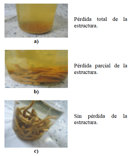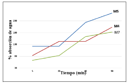 La evaluación de la estructura en medio acuoso de los pellets para cada una de las mezclas (ver tabla 1), se llevó a cabo determinando el porcentaje de absorción de gua, para lo cual se sumergieron 5g de muestra seca en 250 ml de agua destilada, y se determinó la masa de la muestra-saturada en tiempos de 5, 20, 40 y 90 minutos respectivamente. Posterior a este proceso, se realizó inspección visual para determinar el el grado de deterioro de la muestra, clasificandose en: pérdida total de la estructura, cuando a un tiempo menor a 30 min la estructura se pierde y no es posible manipular la muestra (figura 2 a); pérdida parcial de la estructura, cuando a un tiempo menor a 60 min la estructura del pellet se conserva pero no es posible su manipulación (figura 2 b), y sin pérdida de estructura, cuando a un tiempo menor a 90 min se conserva la estructura y es posible su manipulación (figura 2 c). En general, se encontró que las muestras que presentaron la mayor absorción de agua manteniendo su estructura parcial o total fueron en su orden, M4, M5 y M7 respectivamente. En la figura 3, se presenta el comportamiento del porcentaje de absorción de agua en función del tiempo para las muestras M4, M5 y M7, de ésta se infiere que a 90 minutos la muestra M5 presenta el mayor porcentaje de absorción (263%); seguido de M4 (203%) y finalmente M7 (183%).