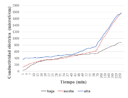 Para estudiar las muestras como medio de trasporte de los macronutrientes, se sumergió 5 g de la muestra activada en las tres concentraciones (baja, media y alta) en 400 ml agua destilada, y se determinó la EC y TDS del agua en función del tiempo, por 6 días (8640 min), en la tabla 3 se presentan dichos resultados. De éstos, se aprecia que a medida que aumenta el tiempo dichos parámetros se incrementan, observándose que la muestra con activación alta fue la que desprendió la mayor cantidad de iones de los macronutrientes al agua como era de esperarse. El comportamiento de la EC en función del tiempo se presenta en la figura 4, donde se observa que a partir del minuto 70 prácticamente todas las concentraciones incrementan drásticamente su EC, siendo notorio el comportamiento de las concentraciones media y alta. Además, teniendo en cuenta que la EC está relacionada con el contenido de arcilla, agua y la concentración de iones intercambiables en una muestra de suelo [13], se puede inferir que la diatomita reciclada sirve de medio de trasporte de los macronutrientes, los cuales pueden ser disueltos en medios acuosos, siendo óptimo su uso en aplicaciones agrícolas o ambientales, afirmación que se corrobora con el incremento en el tiempo de los sólidos totales disueltos (TDS) por los pellets en el agua, llegando a valores de hasta 28416 ppm (ver tabla 3), para la muestra activada en concentración alta.