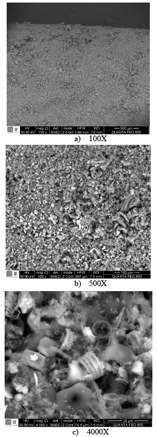 La morfología superficial a 100X, 500X y 4000X usando MEB de M4, activada en concentración alta se presenta en la figura 5. En estas se aprecia una morfología irregular de frústulas de diatomeas parcialmente destruidas con tamaños de orden micrométrico, donde en su interior se observan porosidades submicrométricas, que se convierten en centros activos para alojar los macronutrientes.