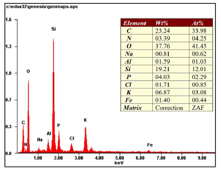 En la figura 6, se presenta la composición química por elemento (microanálisis) usando EDS, para la muestra M4 activada en concentración alta, donde se observa la presencia de los macronutrientes NPK, en concentración de 3.39%, 4.03% y 6.87 %. Por otra parte, se aprecia que la relación C/N= 6.85, lo cual permite clasificar la muestra como un suelo activado crudo [14]. Sin embargo, aunque todo el N está disponible en el pellet, pudiéndose biodegradar, solamente una fracción del carbono lo puede hacer [14], luego la relación C/N puede variar en un suelo, pues tanto el carbono orgánico total como el disponible influirán en dicho factor. En un suelo dicha relación es un índice de la calidad del sustrato orgánico, donde valores altos, permitirán que la materia orgánica se descomponga lentamente, mientras que valores entre 10 y 14 implicarían una mineralización del suelo, permitiendo la estimulación de la actividad microbiana debido a que hay suficientes nutrientes para éstos, así como para las plantas, por otra parte, valores bajos de C/N (<10), permitirá que los microorganismos sean eficientes en la descomposición de la materia orgánica presente en el suelo[15].