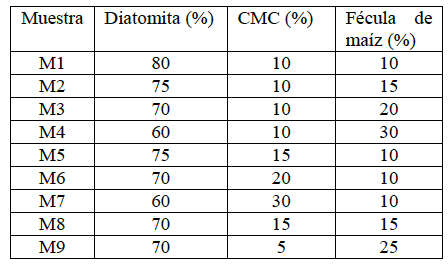 En la tabla 1, se presentan las mezclas en %p/p elaboradas a base de diatomita, CMC y fécula de maíz utilizadas para estudiar el comportamiento de la estructura de los pellets cuando se sumergieran en agua y así seleccionar las mezclas óptimas para realizar el proceso de activación usando la solución de NPK. En ésta se aprecia que la concentración de diatomita varió entre el 60 y 80%, mientras que el porcentaje de CMC osciló entre el 5 y 30%, y el de la fécula de maíz entre el 10 y 25%.