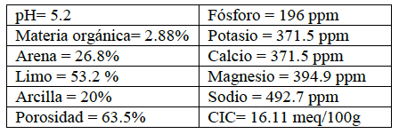 La composición química de las muestras de diatomita proveniente del proceso de filtrado de la cerveza presentó un 46% de humedad, y su composición química por AA se presenta en la tabla 2, en esta se observa que posee un pH ácido, que se debe a los altos contenidos de etanol producto de la fermentación de levaduras y maltas [8], lo cual se complementa con el porcentaje de materia orgánica encontrado en la muestra (2.88%). Por otra parte se halló que la capacidad de intercambio cationico (CIC) fue mayor que 10 (16,11 meq/100 g), lo que indica que la muestra de diatomita reciclada puede ser utilizada para retener la mayor cantidad de nutrientes y por tanto su uso en fertilización, debido a los sitios activos presentes, mantiene en el tiempo los nutrientes en epocas de lluvia [8], [9]. Para el caso de la porosidad de la diatomita reciclada se observa que es del 63,5%, lo cual es menor que la reportada para una muestra comercial de Diatomita Celite®, reducción que se debe al contenido de la levadura, materia orgánica, proteínas y polifenoles que quedan al final del proceso de filtración de la cerveza, saturándola e impidiendo su posterior reutilización con la misma eficiencia [10].