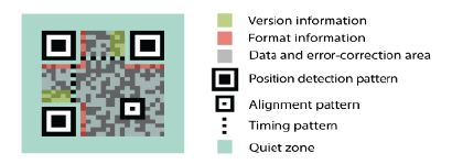 En la figura 1, se puede observar que el código QR está compuesto por distintos módulos, cada uno de ellos, dependiendo su color, oscuro o claro, puede representar un 1 o 0. Así mismo, consta de un módulo cuadrado nominal o zona de tranquilidad que forma una matriz cuadrada que incluye: un patrón de posición, un patrón de alineación, un patrón y un separador de detección de posición y un formato de codificación que incluye, la versión de la información y el código de corrección de errores [7].
