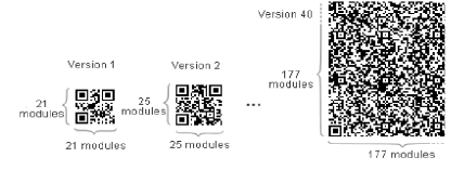 Es posible generar hasta 40 diferentes versiones de códigos QR, cambiándole el número de módulos iniciando con un tamaño desde 21 x 21 módulos siendo esta la versión 1, hasta de 177 x 177 módulos que corresponden a la versión 40 [4] como se muestra Figura 2.