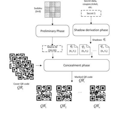 El planteamiento de su modelo propone proteger el mensaje de privacidad propio del código QR con el fin de prevenir el acceso a personas no autorizadas, dado que se valida la legitimidad de quien quiere acceder a la información, esto lo realizan con el uso de mensajes o llaves privado(a)s o secreto(a)s y público(a)s. Los mensajes secretos se dividen en varias sombras y se ocultan en el código QR mediante sustitución de los bits de mensaje público del código QR [21].