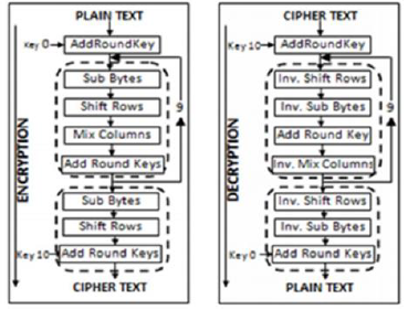 a. AES: El proceso de cifrado de AES inicia con adicionar una ronda de llaves en la primera etapa, siguiendo con nueve rondas de cuatro etapas y luego con diez rondas de tres etapas, para descifrar el procedimiento se lleva a cabo el mismo procedimiento, pero al revés. En la figura 6, se pueden evidenciar las etapas que cada una de estas rondas que se tienen contempladas tanto para el proceso de cifrado como descifrado.