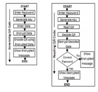 c. SQR: Este método de cifrado fue planteado con el fin solucionar problemas de seguridad en los códigos QR, el cual sus autores nombran Secure a QR Code (SQR). El enfoque que describen es asegurar un código QR con la ayuda de una clave en el lado del generador y la misma clave se usa para obtener la información original en el lado del escáner, utilizando el algoritmo AES para este propósito [22] cuyo proceso se describe en la figura 6. Sin embargo, su propuesta se describe en el siguiente orden: