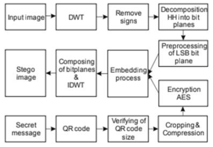 El procedimiento planteado por [25] para embeber un mensaje secreto en forma de QR en una imagen estática contiene los pasos que se describen a continuación, también se muestra el proceso en la figura 8.