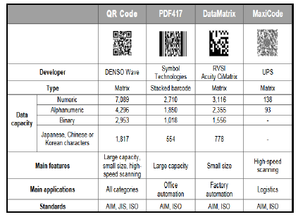 Es importante traer a colación que se han desarrollado distintos códigos que permiten diferentes tamaños de almacenamiento, siendo el propuesto por Denso Wave el que permite mayor almacenamiento de información. Actualmente existen más de veinte tipos de códigos bidimensionales, en la tabla 1 se resume las características de algunos códigos gráficos de almacenamiento de información.